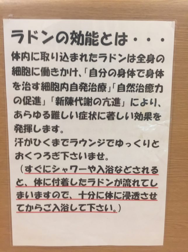 サウナのような感じで希望荘の湯に含まれるラジウムが帰化するとラドンとなります。そのラドンをサウナのような環境で体内に取り組みます。