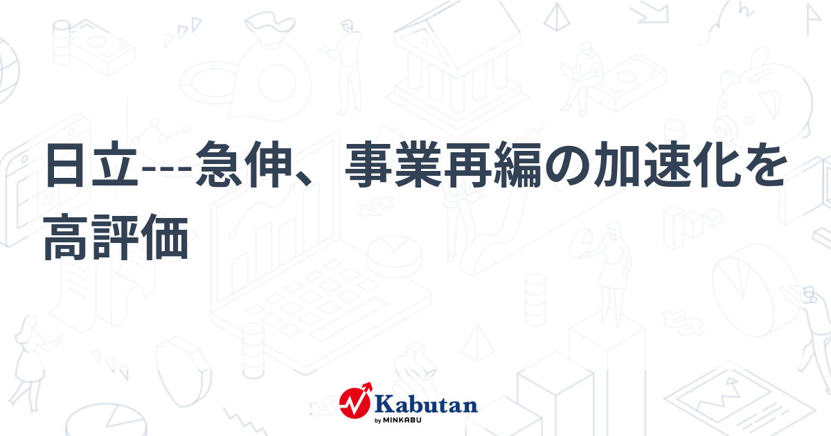 日立---急伸、事業再編の加速化を高評価日立は急伸。日立化成を売却する方向で検討に入ったとの報道を受けて、...