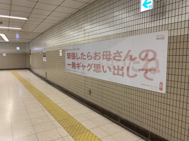 東大前駅の明治R1の広告見る方向によって文字が変わるのが凄い!、